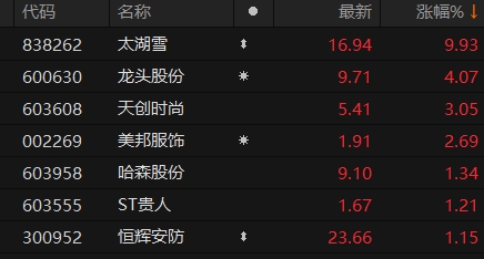 A股服装家纺板块震荡上行 太湖雪涨超9%