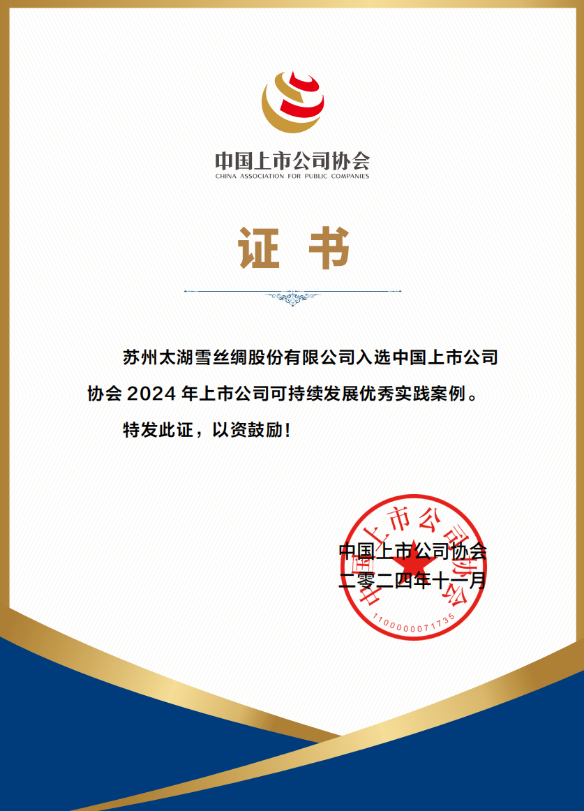 近日,中国上市公司协会组织开展2024年上市公司ESG实践案例征集和汇编工作,并发布了年度上市公司ESG优秀实践案例。太湖雪作为大力弘扬传统丝绸文化,依托桑蚕产业积极参与乡村振兴的优秀品牌代表,成功入选2024年上市公司ESG优秀实践案例,这也是太湖雪公司连续第二年入选该项案例。