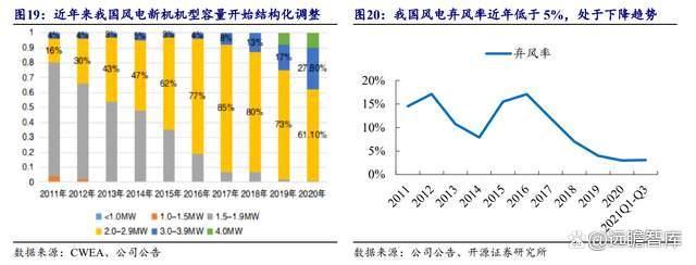 风电降本需求提高,风电降本路径主要有两种方式:一是提高机组利用小时数,减少弃风率,截至 2021Q1-Q3,我国当前弃风率已经降至 3%;二是风机大型化。
