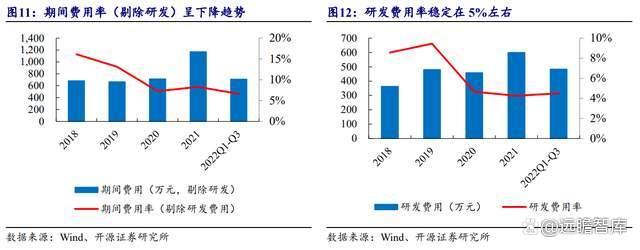 剔除研发的期间费用2020年前呈现下降趋势,后逐渐稳定于 7%。研发费用稳中有升,2020年营收翻倍导致研发费用率下滑,总体研发费用率基本稳定于 5%。