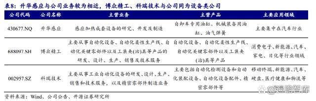 选取升华感应、博众精工、科瑞技术作为同行业可比公司。其中,博众精工、科瑞技术虽为自动化设备类公司,但与公司同为设备类公司,具备成套设备研发设计制造能力,下游包含新能源、汽车类应用领域,具有一定程度的可比性。