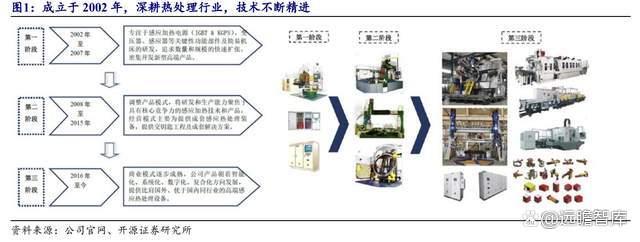 发展共经历三个阶段,2007年以前以研发感应加热电源、变压器、感应器等关键性功能部件及简易机床为主,随后调整产品模式,转向主要提供成套感应热处理装备及解决方案模式,2016年以后则朝着智能化、系统化、数字化、复合化方向发展,产品比肩国外同行业高端感应热处理装备。