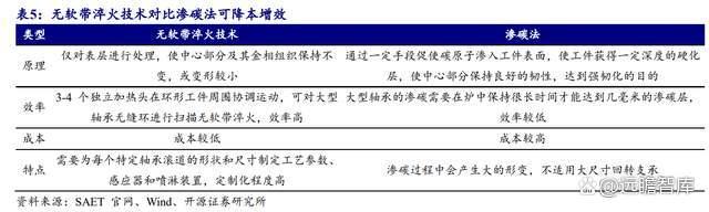 在轴承热处理环节,国外龙头采用的主流工艺是渗碳法,渗碳法成本高、效率低。随着技术和原材料的进步,热处理方式可以用感应淬火的方式替代渗碳法工艺,性能更优,可以使得效率提高 50%,成本降低 30%左右,感应淬火已经变成了主要的趋势。