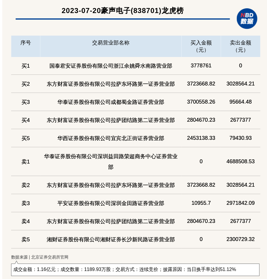 2023年7月20日,北交所上市公司豪声电子(838701,收盘价:9.96元)登上龙虎榜,交易方式是连续竞价,披露原因是当日换手率达到51.12%,成交数量1189.93万股,成交金额1.16亿元。买一席位为国泰君安证券股份有限公司浙江余姚舜水南路营业部,买入377.88万元;卖一席位为华泰证券股份有限公司深圳益田路荣超商务中心证券营业部,卖出468.85万元。