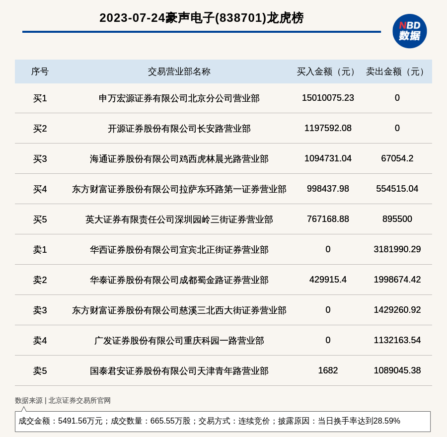 2023年7月24日,北交所上市公司豪声电子(838701,收盘价:8.1元)登上龙虎榜,交易方式是连续竞价,披露原因是当日换手率达到28.59%,成交数量665.55万股,成交金额5491.56万元。买一席位为申万宏源证券有限公司北京分公司营业部,买入1501.01万元;卖一席位为华西证券股份有限公司宜宾北正街证券营业部,卖出318.2万元。