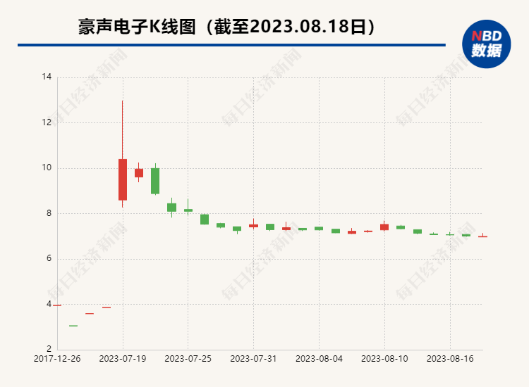 8月18日,北交所上市公司豪声电子(BJ838701,股价6.99元,市值6.85亿元)发布公告,公司股票自2023年7月24日起至2023年8月18日止,公司股票连续20个交易日的收盘价低于发行价格,已触发稳定股价措施启动条件,2023年8月18日为触发日。