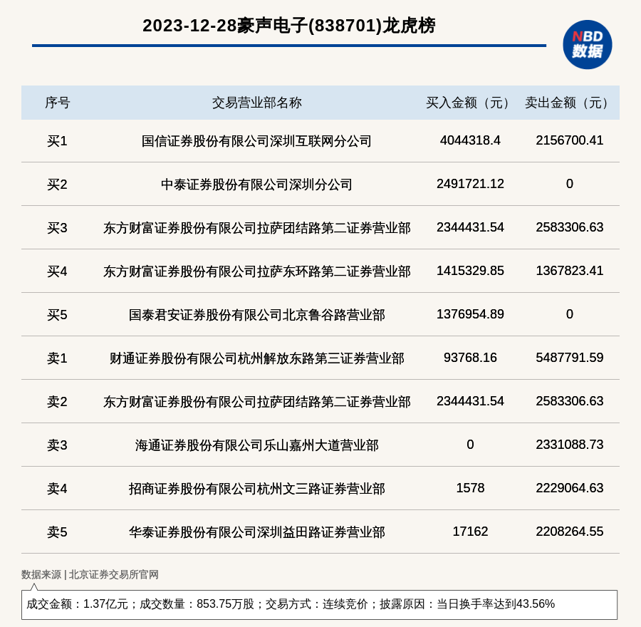 2023年12月28日,北交所上市公司豪声电子(838701,收盘价:15.77元)登上龙虎榜,交易方式是连续竞价,披露原因是当日换手率达到43.56%,成交数量853.75万股,成交金额1.37亿元。买一席位为国信证券股份有限公司深圳互联网分公司,买入404.43万元;卖一席位为财通证券股份有限公司杭州解放东路第三证券营业部,卖出548.78万元。
