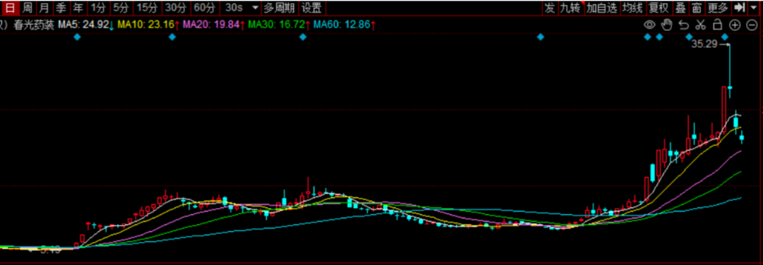 春光药装从2月12日开始持续走强,仅一个多月时间股价最大涨幅高达2.6倍。其中,该股在2月26日、2月28日、3月17日均收出了30%的涨停板,走势令人瞠目结舌。