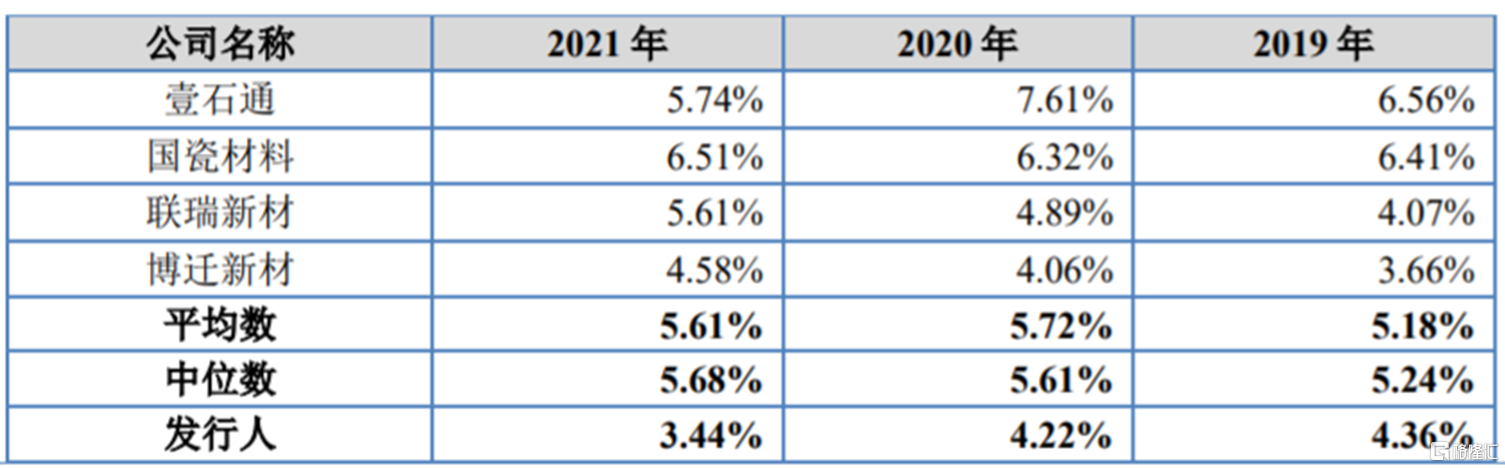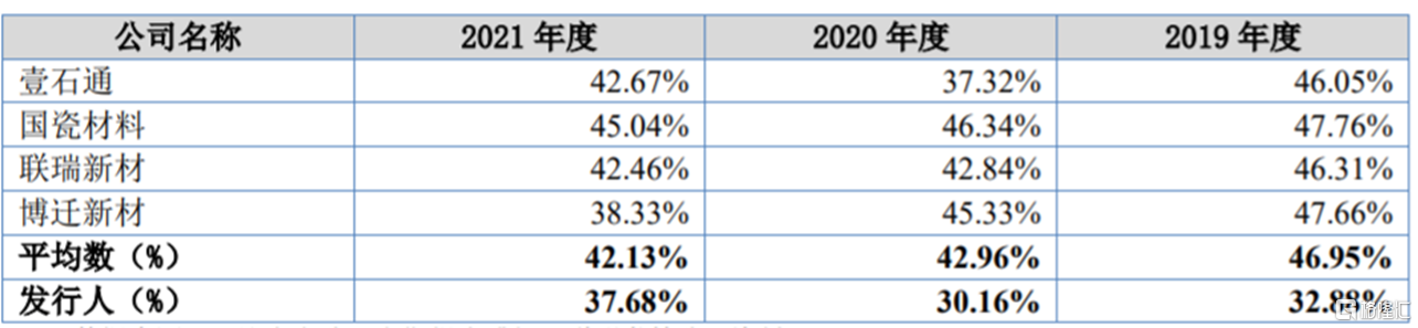 2019-2021年,天马新材综合毛利率分别为32.88%、30.16%、37.68%,存在波动,整体均低于可比公司均值。