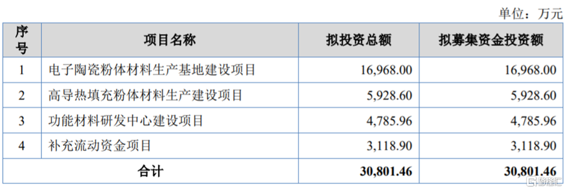 本次IPO所募集的资金主要用于电子陶瓷粉体材料生产基地建设项目、高导热填充粉体材料生产建设项目、功能材料研发中心建设项目、补充流动资金。