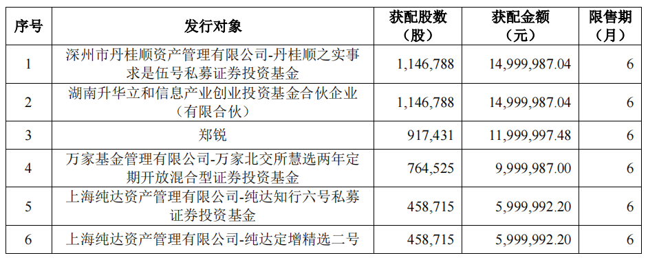 公告还披露,本次发行对象最终确定为9家,所有发行对象均以现金方式认购本次发行的普通股股票,其中包括公募和券商机构。