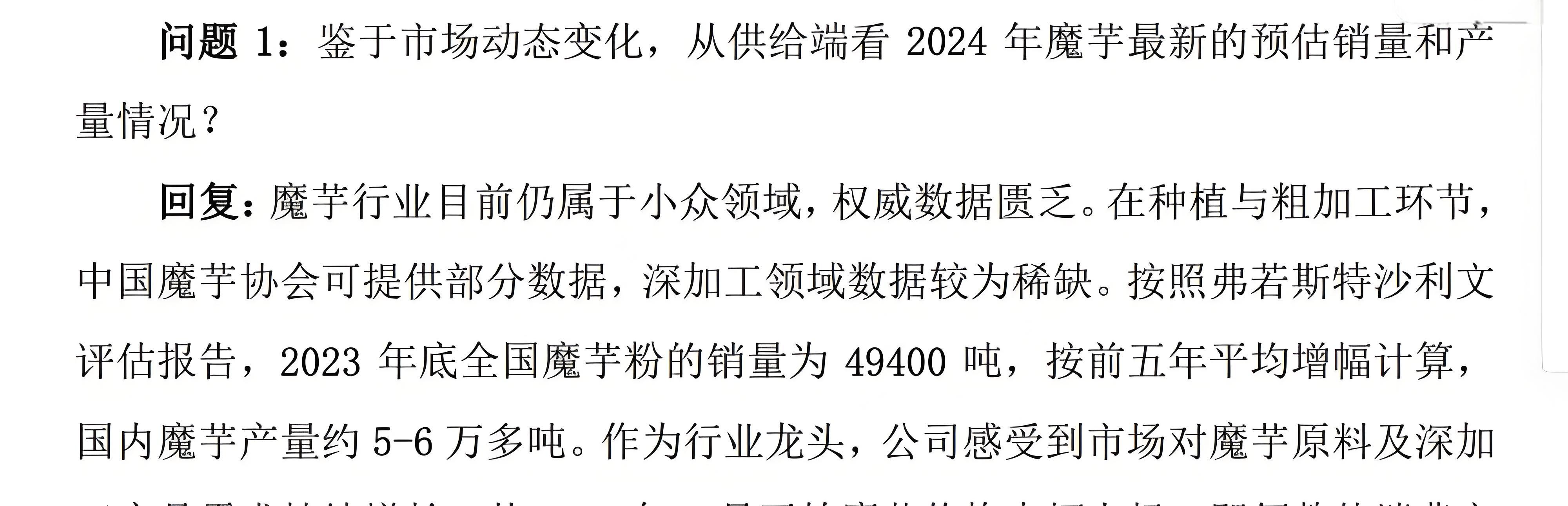 另有数据显示,2023年底全国魔芋粉销量为4.94万吨,但国内魔芋产量约为5-6万吨,也就是说绝大多数魔芋产量都由国内市场销售。