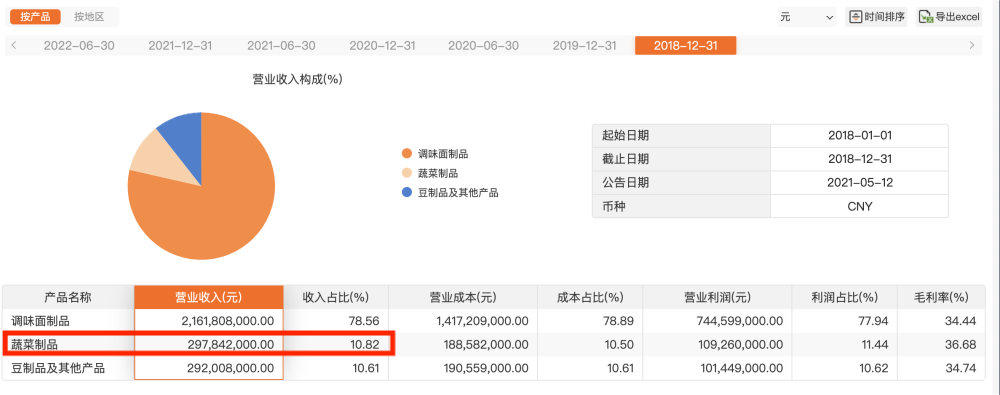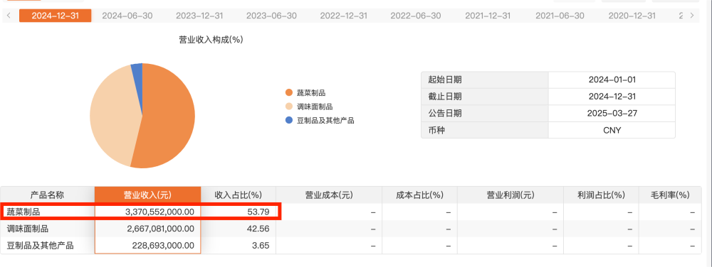 卫龙历年年报显示,2018年,其蔬菜制品收入占比仅为10.82%;到2024底,蔬菜制品的营收占比已达到了53.79%。