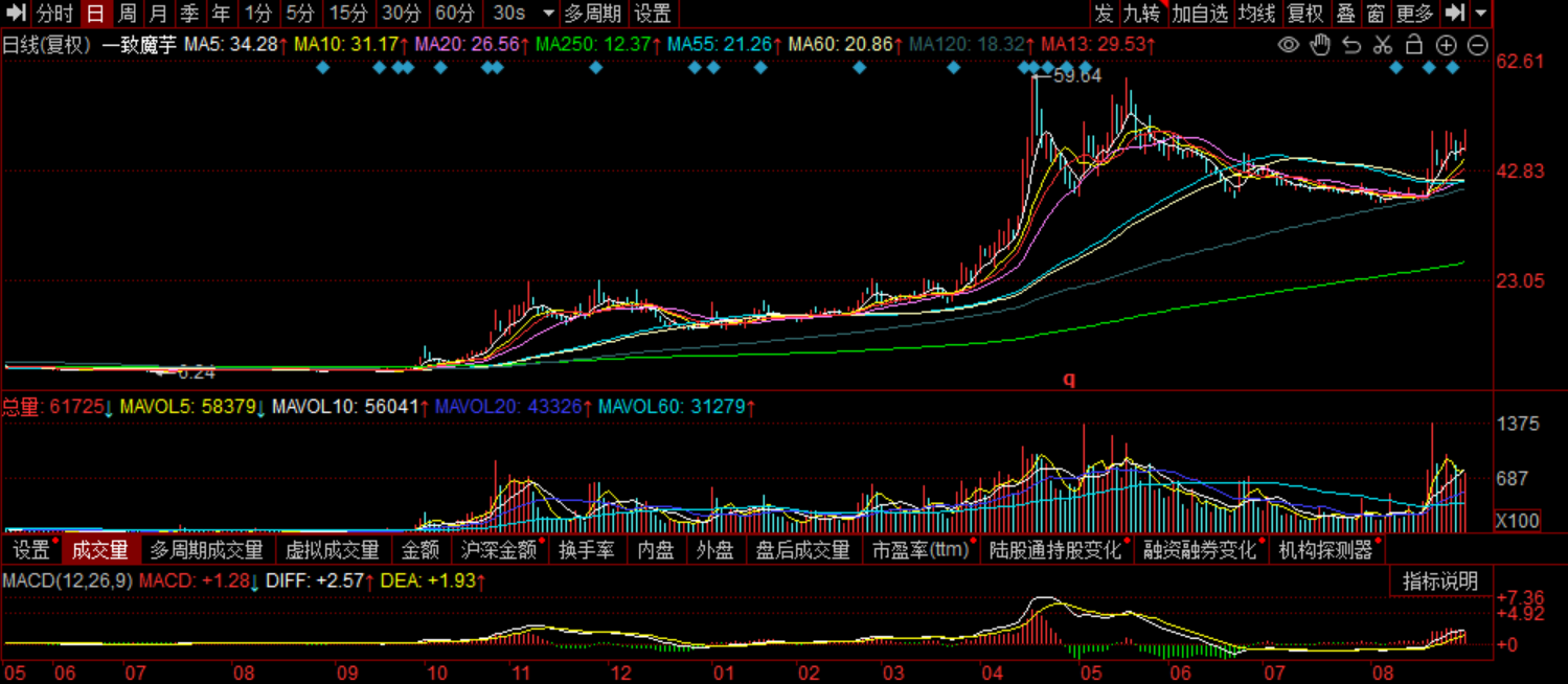8月29日,一致魔芋报收47.42元/股,这一价格较年初已涨了223.56%,若拉长到1年时间来看,其股价涨幅更是高达6倍,公司市盈率(TTM)为51.85倍。