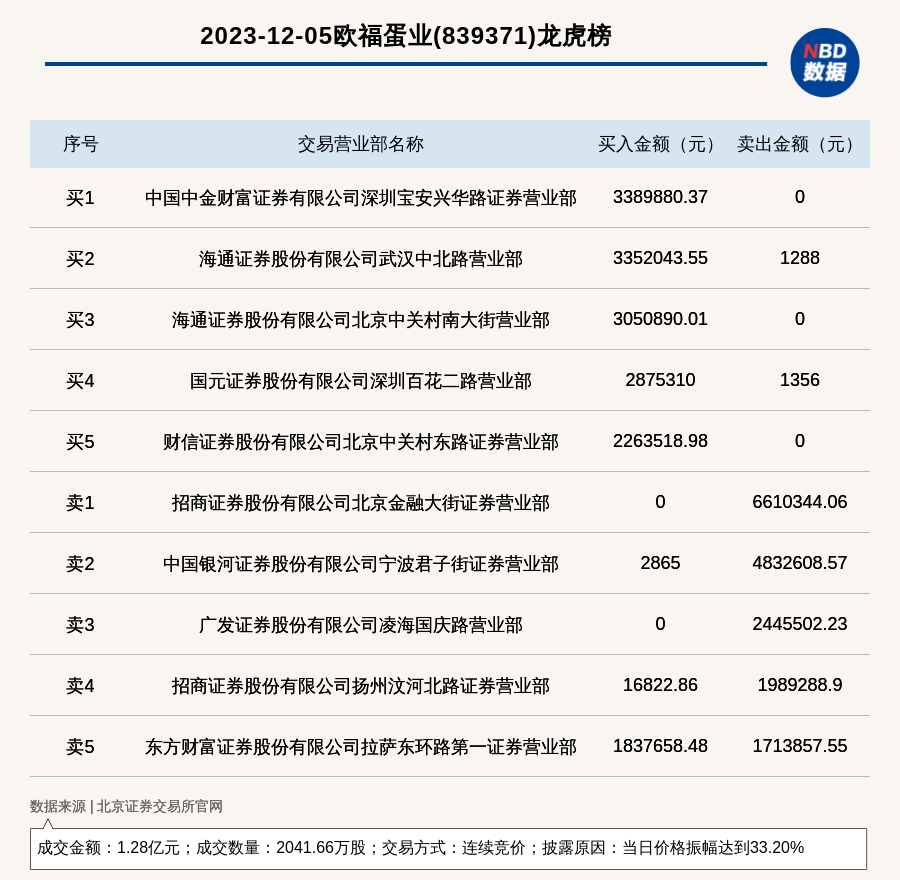 每经讯,2023年12月5日,北交所上市公司欧福蛋业(839371,收盘价:6.78元)登上龙虎榜,交易方式是连续竞价,披露原因是当日价格振幅达到33.20%,成交数量2041.66万股,成交金额1.28亿元。买一席位为中国中金财富证券有限公司深圳宝安兴华路证券营业部,买入338.99万元;卖一席位为招商证券股份有限公司北京金融大街证券营业部,卖出661.03万元。