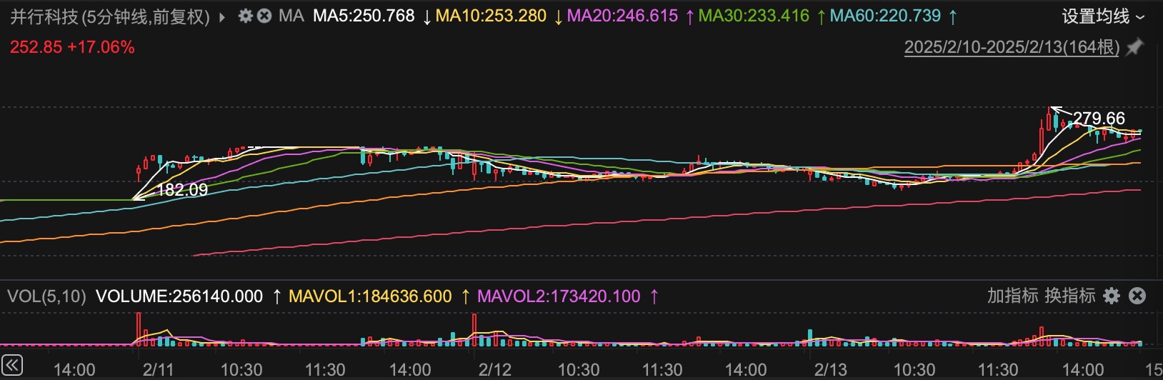 (记者胡嘉树)在DeepSeek概念催化下,2月13日盘中,并行科技股价大幅拉升,涨超20%,创历史新高279.66元/股。截至收盘,公司股价收报252.85元/股。1月以来,并行科技股价已涨超266%。