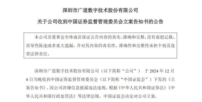 12月4日晚,广道数字发布《关于公司收到中国证券监督管理委员会立案告知书的公告》,公告显示广道数字于 12 月4 日当晚收到中国证监会下发的《立案告知书》。因公司涉嫌信息披露违法违规,根据《中华人民共和国证券法》《中华人民共和国行政处罚法》等法律法规,中国证监会决定对公司立案。