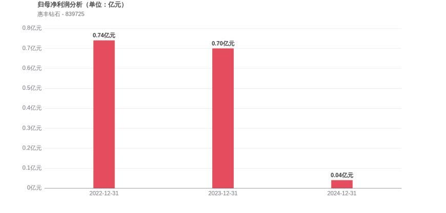 利润角度分析,2022年惠丰钻石实现归母净利润0.74亿元,2024年0.04亿元。归母净利润连续两年下滑,2024年同比下降94.36%。