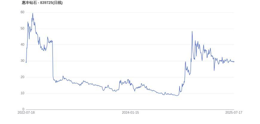 从上市首日至今,惠丰钻石的市值实现了1.08倍的增长。2024年12月10日,惠丰钻石的市值巅峰达到47.65亿元,股价也顺应升至52.2元。而至2025年7月17日收盘,惠丰钻石的股价为29.55元,市值为26.97亿元,相比峰值时期市值减少20.67亿元,市值蒸发了43.39%。