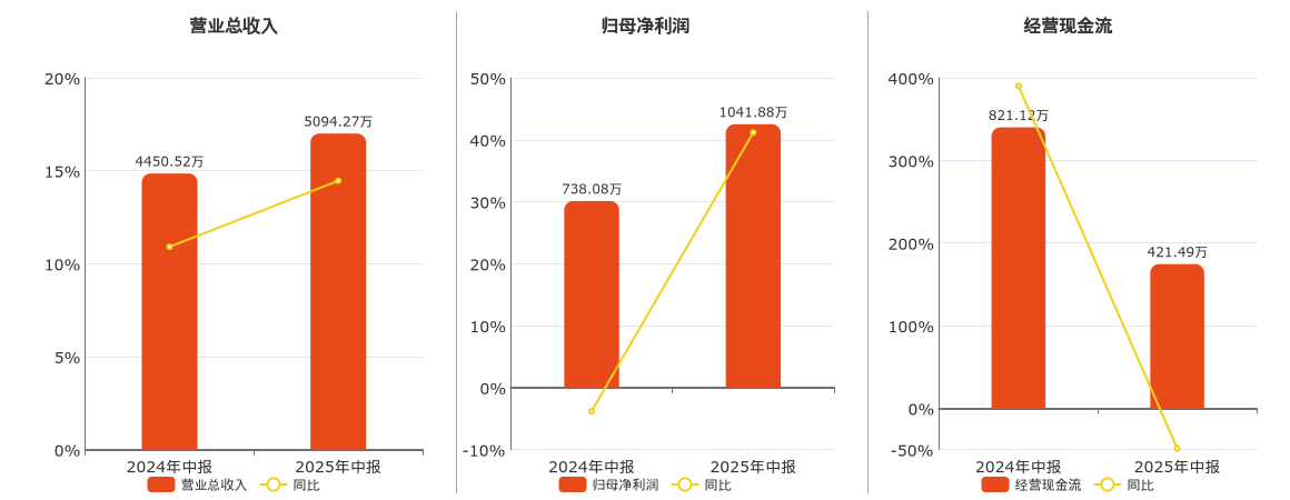 公司营业总收入为5094.27万元,较去年同报告期营业总收入增加643.75万元,实现5年连续上涨,同比较去年同期上涨14.46%。归母净利润为1041.88万元,较去年同报告期归母净利润增加303.80万元,同比较去年同期上涨41.16%。经营活动现金净流入为421.49万元。