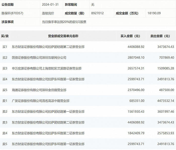 1月31日,雅葆轩今日涨9.25%,全天换手率达38.48%,振幅达24.72%。龙虎榜数据显示,营业部席位合计净卖出39.07万元。其中,东方财富证券拉萨团结路第二证券营业部、国信证券深圳互联网分公司分别买入440.61万元、280.70万元;广发证券茂名高凉中路营业部、东方财富证券拉萨团结路第一证券营业部分别卖出447.35万元、360.20万元。