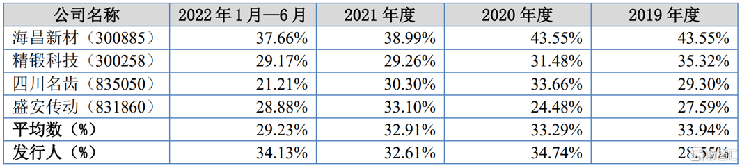 报告期内,公司的主营业务毛利率分别为28.81%、36.06%、34.01%和35.31%,低于可比公司海昌新材,高于精锻科技、四川名齿、盛安传动。
