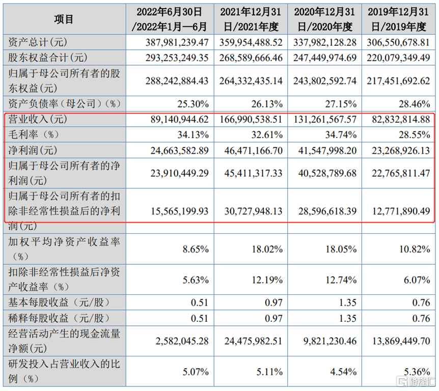2019年至2022年1-6月各报告期,公司的营业收入分别为8283.28万元、1.31亿元、1.67亿元和8914.09万元,相应的归母净利润分别为2276.58万元、4052.88万元、4541.13万元和2391.04万元。