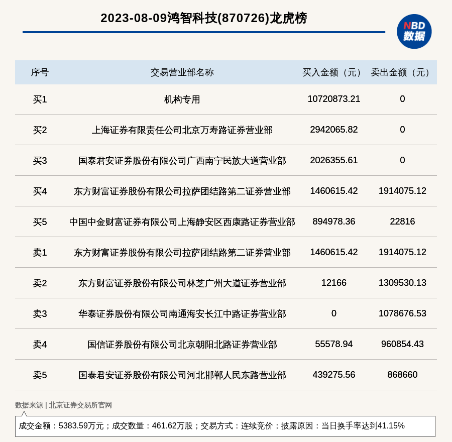2023年8月9日,北交所上市公司鸿智科技(870726,收盘价:12.12元)登上龙虎榜,交易方式是连续竞价,披露原因是当日换手率达到41.15%,成交数量461.62万股,成交金额5383.59万元。买一席位为机构专用,买入1072.09万元;卖一席位为东方财富证券股份有限公司拉萨团结路第二证券营业部,卖出191.41万元。