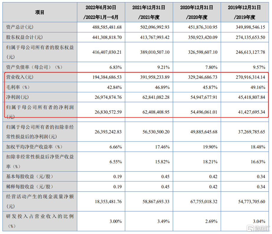 2019年至2022年1-6月各报告期,绿亨科技的营业收入分别为2.71亿元、3.29亿元、3.92亿元和1.94亿元,相应的归母净利润分别为4142.77万元、5449.61万元、6240.84万元和2683.06万元。