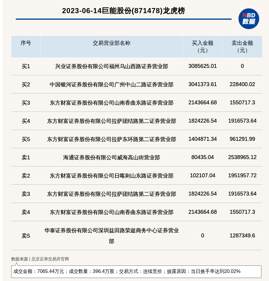 2023年6月14日,北交所上市公司巨能股份(871478,收盘价:17.13元)登上龙虎榜,交易方式是连续竞价,披露原因是当日换手率达到20.02%,成交数量396.4万股,成交金额7065.44万元。买一席位为兴业证券股份有限公司福州乌山西路证券营业部,买入308.56万元;卖一席位为海通证券股份有限公司威海高山街营业部,卖出253.9万元。