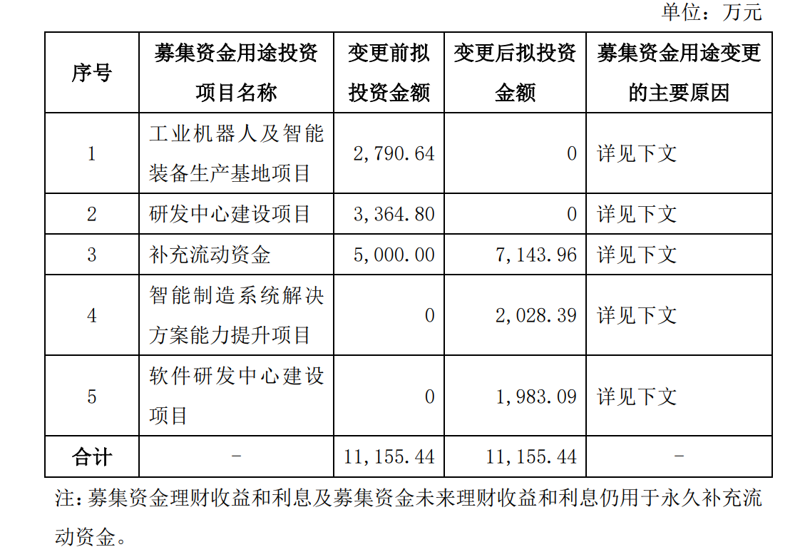《每日经济新闻》记者注意到,根据招股书,原本巨能股份拟募集资金为2.11亿元,其中1.61亿元拟用于工业机器人及智能装备研发生产基地建设项目,5000万元同样用于补充流动资金,也就是说实际募集资金较此前计划差距近1亿元。