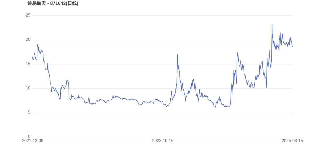 2025年5月9日,通易航天的市值巅峰达到25.07亿元,股价也顺应升至24.18元。而至8月15日收盘,通易航天的股价为18.67元,市值为19.36亿元,相比峰值时期市值减少5.71亿元,市值蒸发了22.79%。