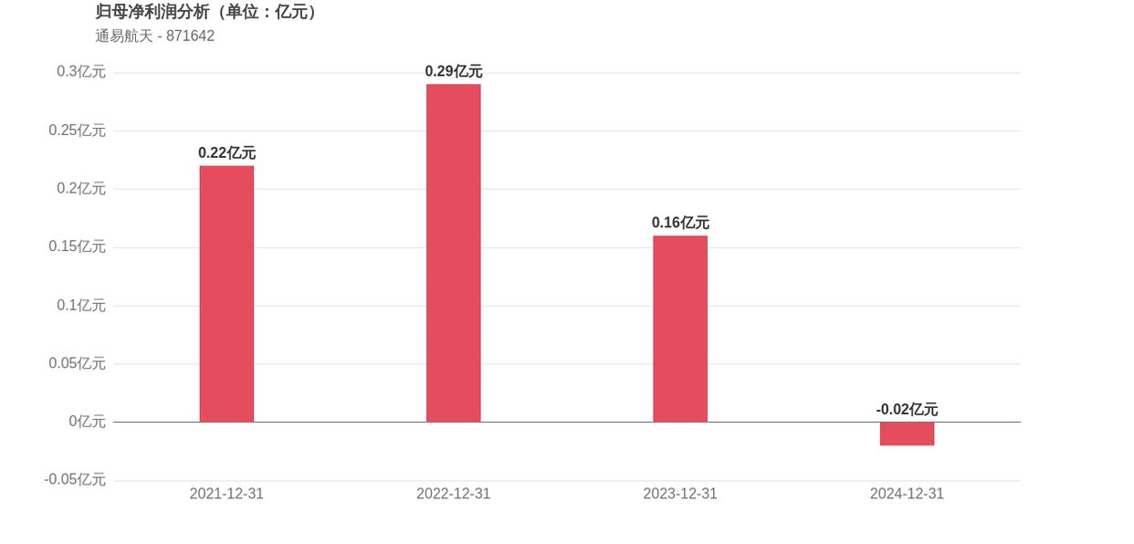 通易航天上市的2021年,当年实现归母净利润0.22亿元。截至最新完整财年的2024年,公司实现-0.02亿元的归母净利润,近年累计下降了107.20%。这4年间,通易航天有1年出现亏损。