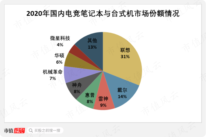 根据QY Research研究报告数据,2020年雷神在国内电竞笔记本和台式电脑市场按照销量口径计算的市占率约为9%,位列第三,仅次于联想的31%与戴尔的14%。