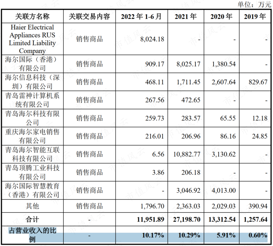 其次在销售方面,2022H1雷神向海尔集团及其下属企业的关联销售金额占营业收入的比例约为10%,虽较前两年有所提高,但对主营业务收入的影响较小。