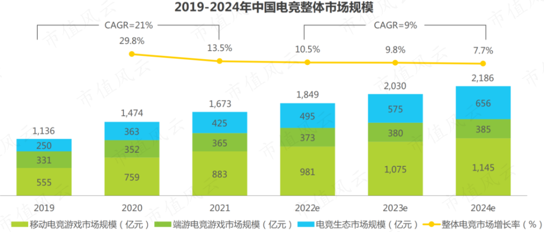据艾瑞咨询统计,2021年中国电竞市场规模约1673亿元,随着电竞赛事和电竞内容影响力的快速提升,电竞版权、赛事赞助、内容制作等电竞赛事商业化仍将保持较高增速,预计到2024年国内电竞市场规模将超过2000亿元。