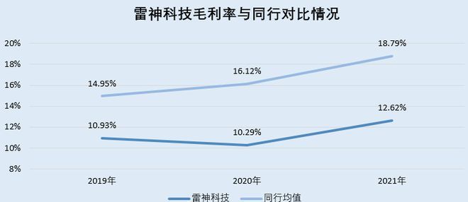 2019~2021年及2022年1~6月,雷神科技上述可比同行的毛利率均值分别为14.95%、16.12%、18.79%、16.89%,同期,雷神科技的毛利率分别为10.93%、10.29%、12.62%、11.83%。由此可以看出,2019~2021年,雷神科技的毛利率持续低于同行可比公司均值。