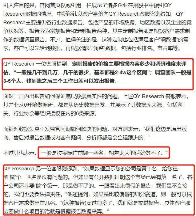 招股说明书的“第三节风险因素”部分显示,根据QY Research研究报告数据,国内电竞笔记本电脑和台式机市场按照销量口径,雷神科技排名第三,仅次于联想、戴尔,针对这一排名,早在2022年8月份,中新经纬就曾质疑,并以客户身份向QY Research客服咨询得知,可“按需定制”数据报告,而这种需求包括“把客户的数据做得好看一点,比如提高客户在行业的排名”等,钱到账3个工作日即可出报告,报价最少千元,最贵不过四万元。