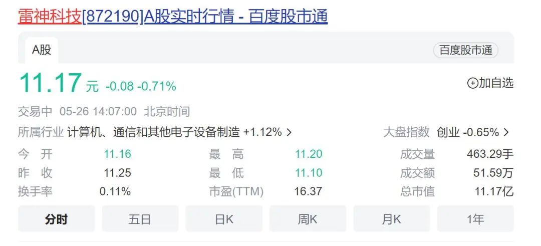 作为国内电竞设备上市公司,雷神科技号称“电竞设备第一股”(872190.BJ),但其在资本市场的表现却并不怎么好,上市首日虽然以22.00元/股开盘,当天就破发,截至5月26日,其股价更是仅有11.17元/股,股价下滑49.3%,接近“腰斩”。