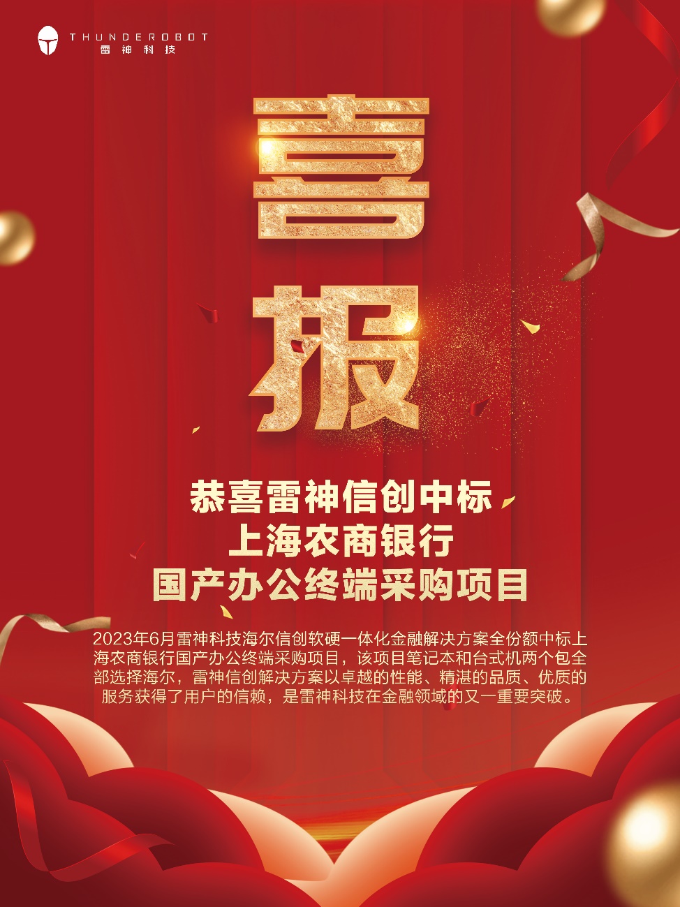 近日,雷神科技信创软硬件一体化解决方案从众多品牌中脱颖而出,全份额中标上海农商银行国产办公终端采购项目,助力金融信创发展。据悉,上次该项目招标时也采用了雷神科技的信创方案,连续成功中标,既是对雷神科技在国产信创领域雄厚的综合实力、优质的服务和良好的口碑的肯定认可,同时也为雷神科技后续信创业务市场的开拓奠定了坚实的基础。