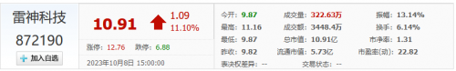 2023年9月28日,雷神正式发布全球首款搭载星闪技术的电竞鼠标ML903星闪,这是星闪技术在电竞装备领域的首次亮相,标志着星闪生态商业化落地进程的进一步提速。当日,资本市场反响积极,雷神科技高开高走表现强势,报收10.91元/股,涨幅达11.10%,创历史新高。