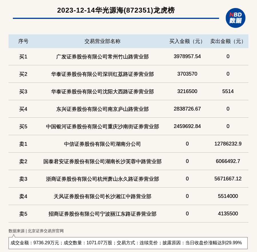 2023年12月14日,北交所上市公司华光源海(872351,收盘价:9.19元)登上龙虎榜,交易方式是连续竞价,披露原因是当日收盘价涨幅达到29.99%,成交数量1071.07万股,成交金额9736.29万元。买一席位为广发证券股份有限公司常州竹山路营业部,买入397.9万元;卖一席位为中信证券股份有限公司湖南分公司,卖出1278.62万元。