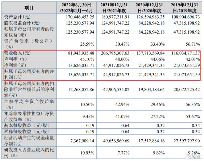 2019年至2022年1-6月各报告期,公司的营业收入分别为1.16亿元、1.38亿元、2.07亿元和8194.39万元,对应的归母净利润分别为2107.37万元、2142.93万元、4497.70万元和1362.60万元。
