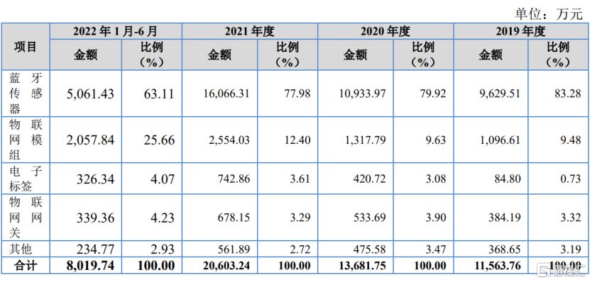 公司的主营业务收入主要来自基于5.X低功耗蓝牙技术的传感器、物联网模组、电子标签及物联网网关,其中蓝牙传感器的收入占比由2019年的83.28%下降至2022年上半年的63.11%,而物联网模组收入占比由9.48%上升至25.66%。