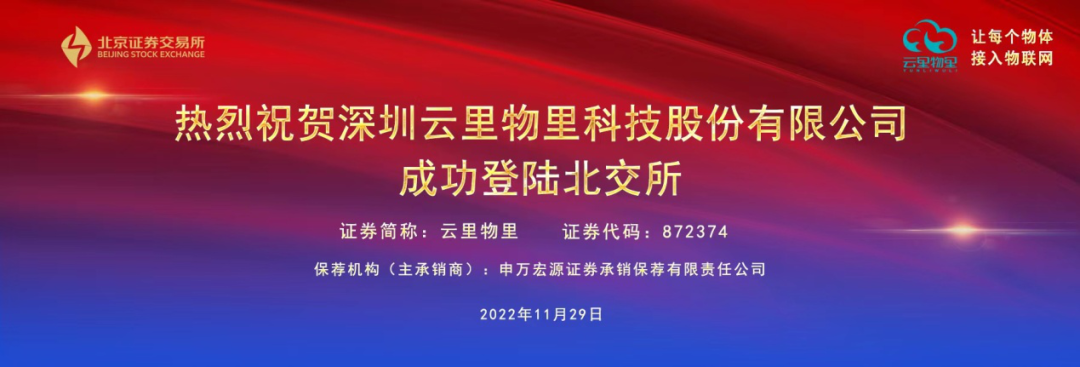 2022年11月29日,深圳云里物里科技股份有限公司(证券代码:872374)在北交所上市。