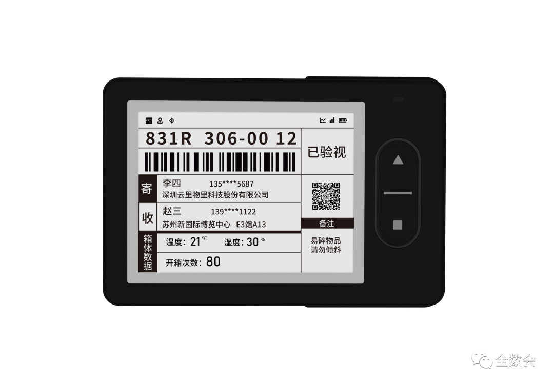 智能电子面单:以解决客户无法监测货品从装载到交付过程实时状态的痛点为目标进行设计,以可实时修改显示内容的电子墨水屏作为显示工具,设计有专门的传感器外设接口,可搭载温湿度、气体、压力、水浸等传感器,电子墨水屏上还可显示传统纸质面单上能体现的所有信息,并可结合相关传感器设备,将接收到的传感器数据展示在面单上。