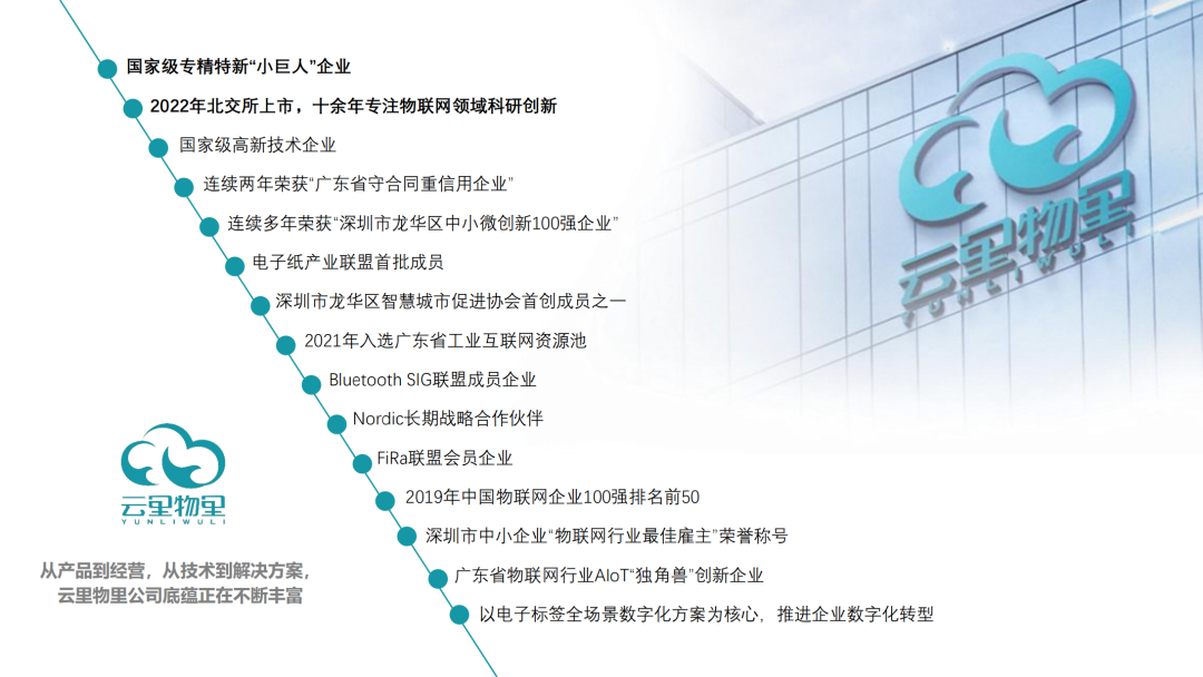 深圳云里物里科技股份有限公司(股票代码:872374),从2007年成立,到2017年挂牌新三板,2021年入选创新层,再到2022年北交所上市,一路走来,云里物里秉承“让每个物体接入物联网”的企业使命,十余年专注于物联网领域的研发创新,在办公、工业仓储、医疗、零售、楼宇和智慧城市等领域为用户提供从研发、设计、生产到销售的一体化低功耗物联网软硬件产品和解决方案,助力传统行业的数字化转型和建设。