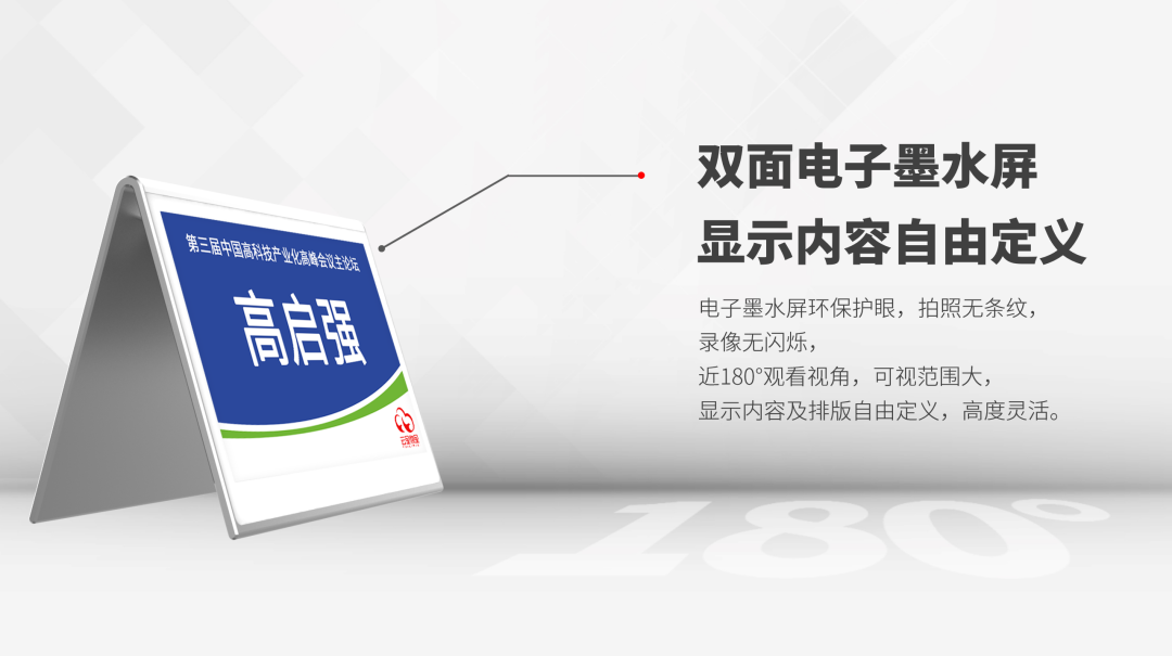 V型智能电子桌牌是为大型会议论坛的数字化显示而生。它能双面显示不同内容,在手机、电脑上更改信息,桌牌实时更新内容,解决了纸质会议桌牌效率低下、出错率高、资源浪费等问题。