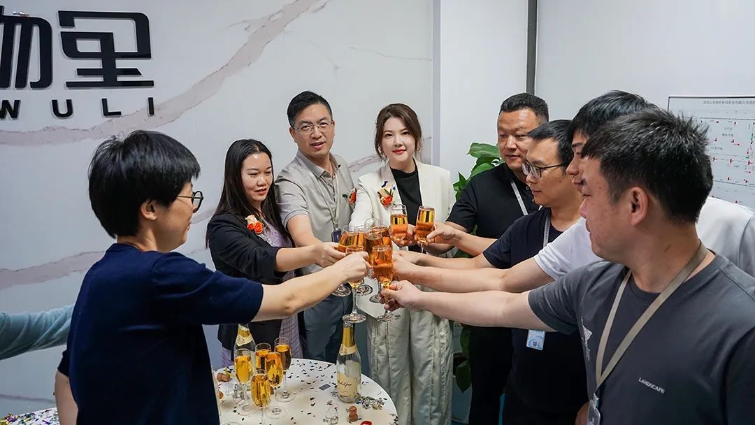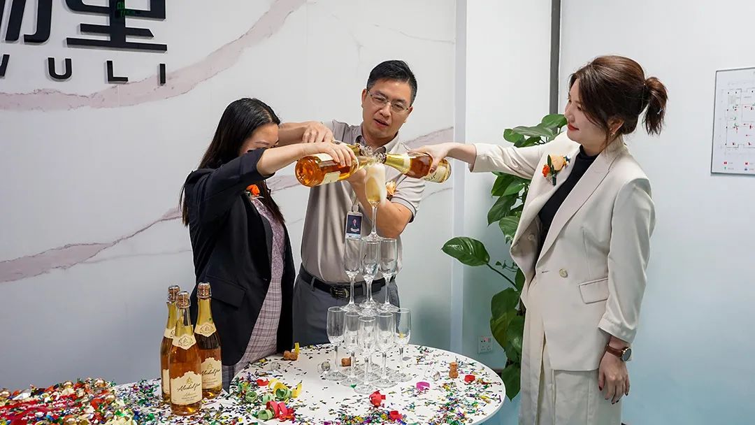 随后,领导们一同注满香槟塔,芬芳的香槟酒在欢乐中沸腾,如同云里物里不断发展的未来。