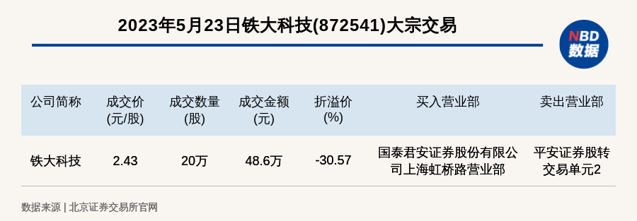 2023年5月23日,北交所上市公司铁大科技(872541,收盘价:3.5元)发生一笔大宗交易,成交价2.43元/股,成交数量20万股,成交金额48.6万元,折价30.57%。买入营业部是国泰君安证券股份有限公司上海虹桥路营业部,卖出营业部是平安证券股转交易单元2。
